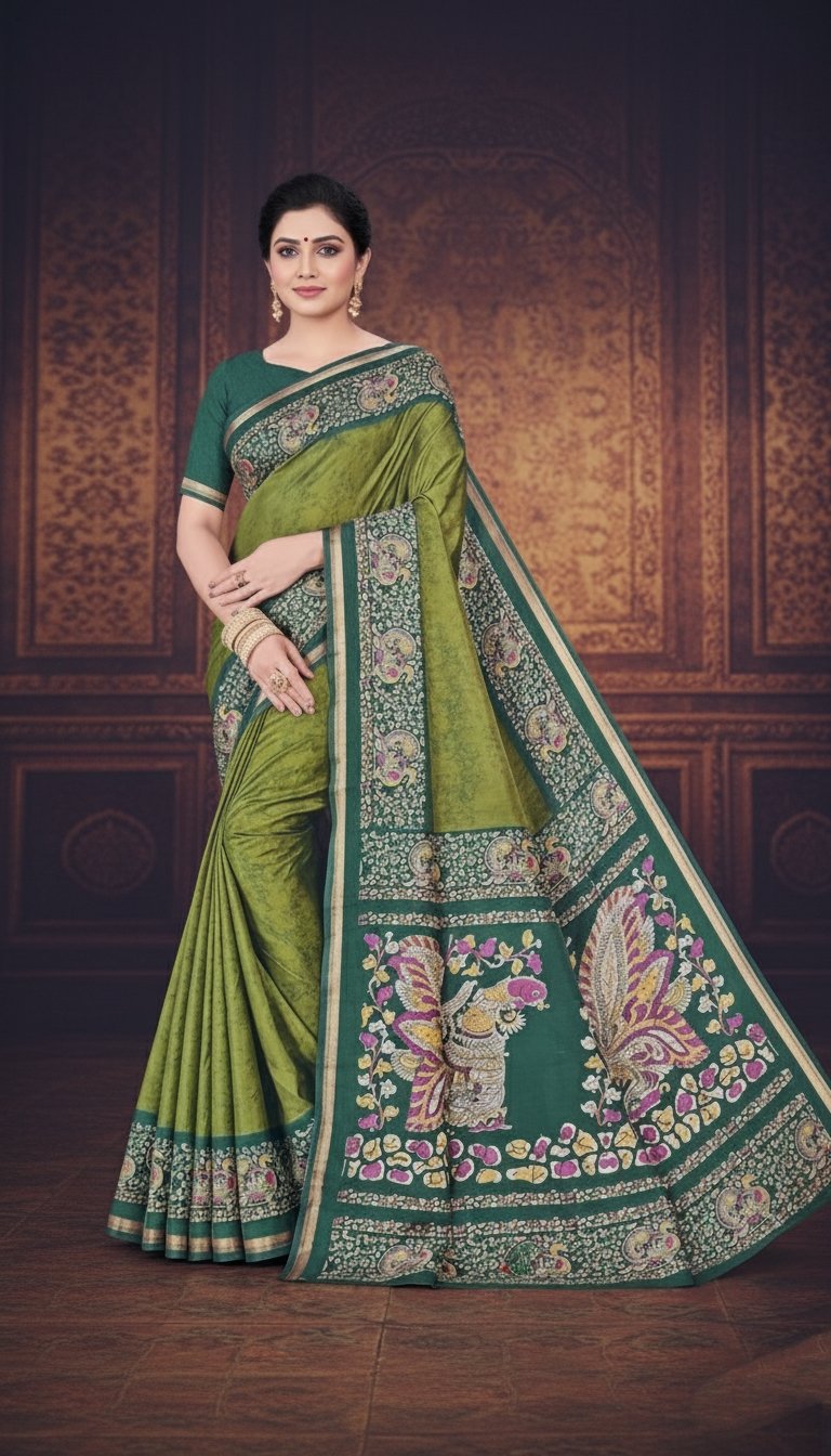 ▪Kalamkari Pallu Dola Silk Saree ▪Smooth & flowy Dola fabric with a soft touch feel.